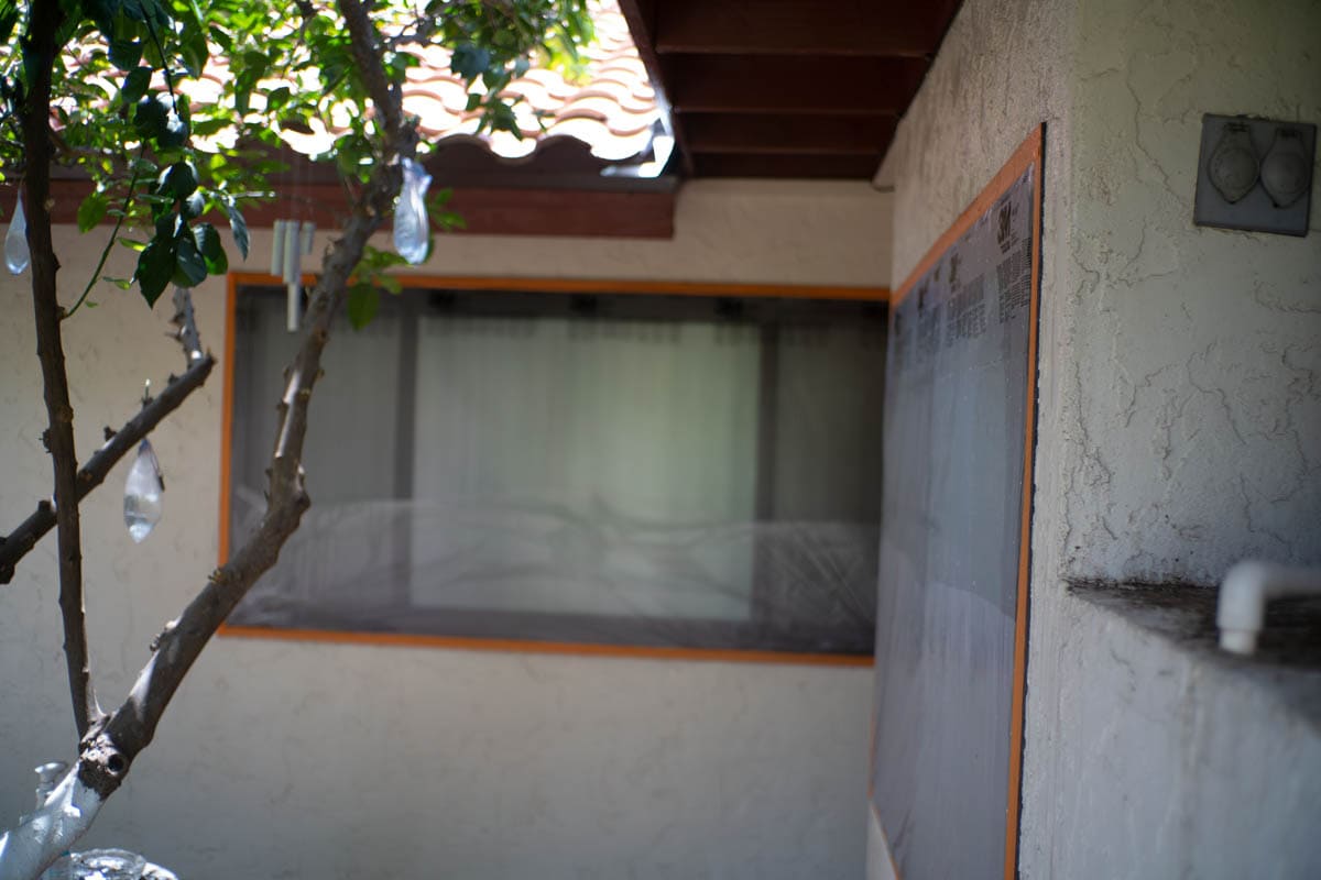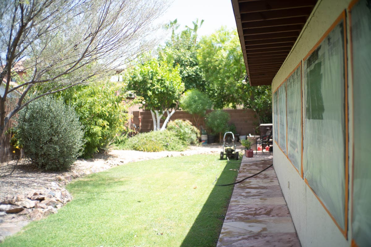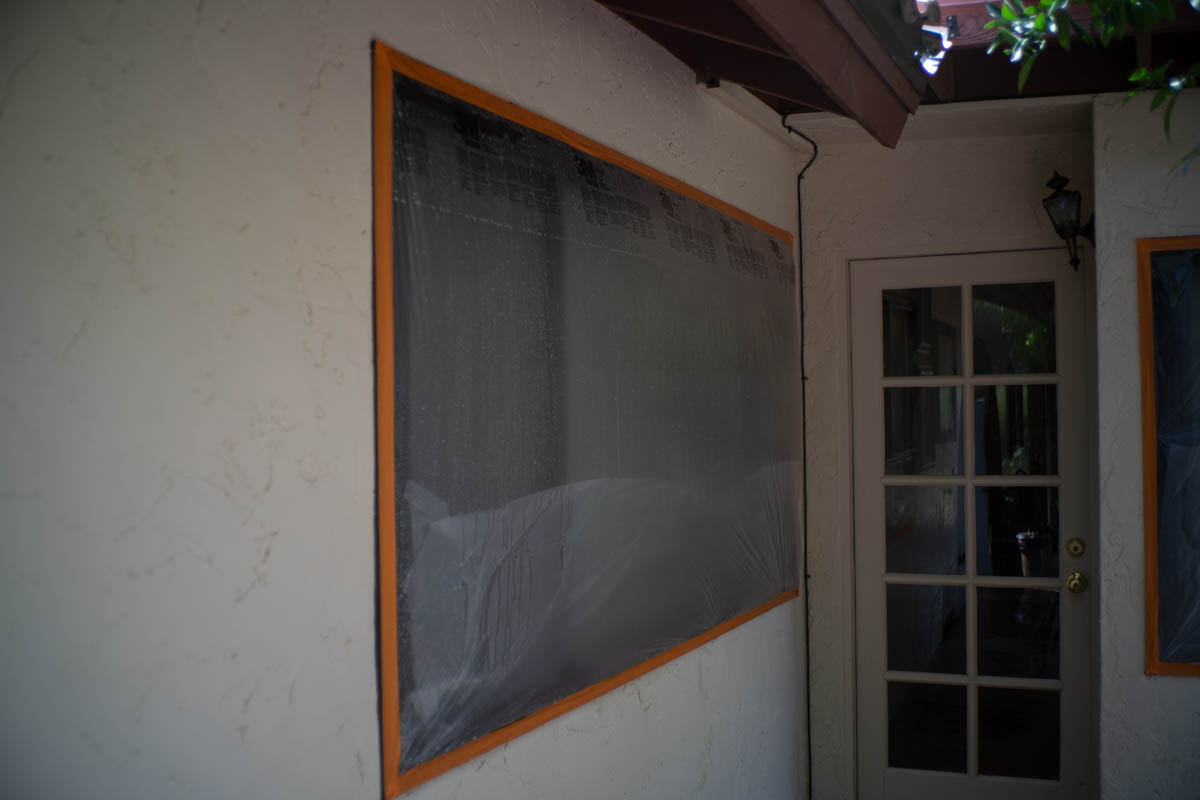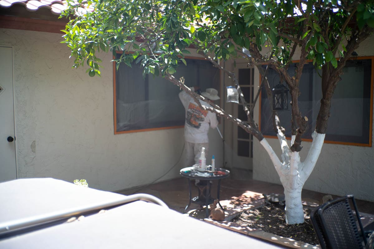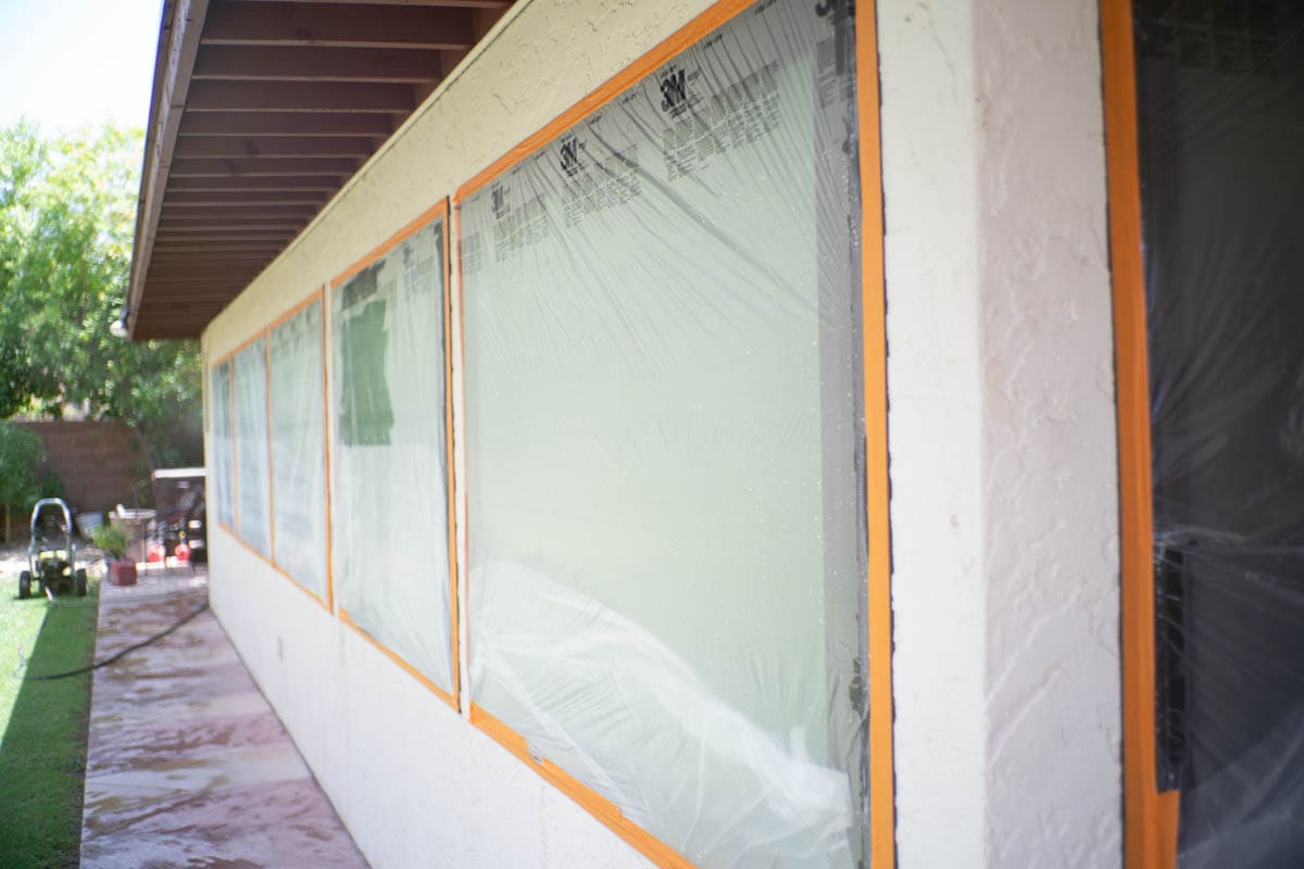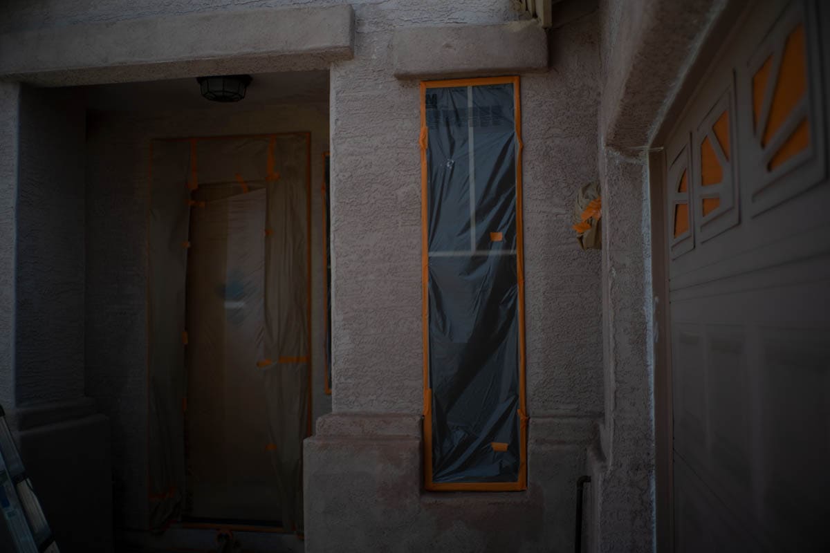 Windows are fully masked with film or plastic to ensure 100% coverage and no overspray hits your windows or your screens. Lights are fully masked and walkways, patios and other concrete areas near your home will be covered in a thick plastic to ensure no drips of paint get where they should not.