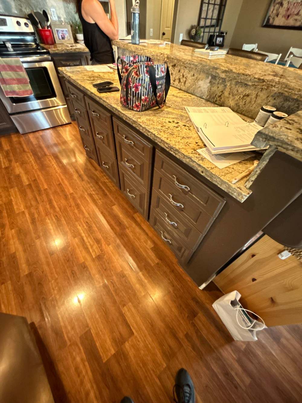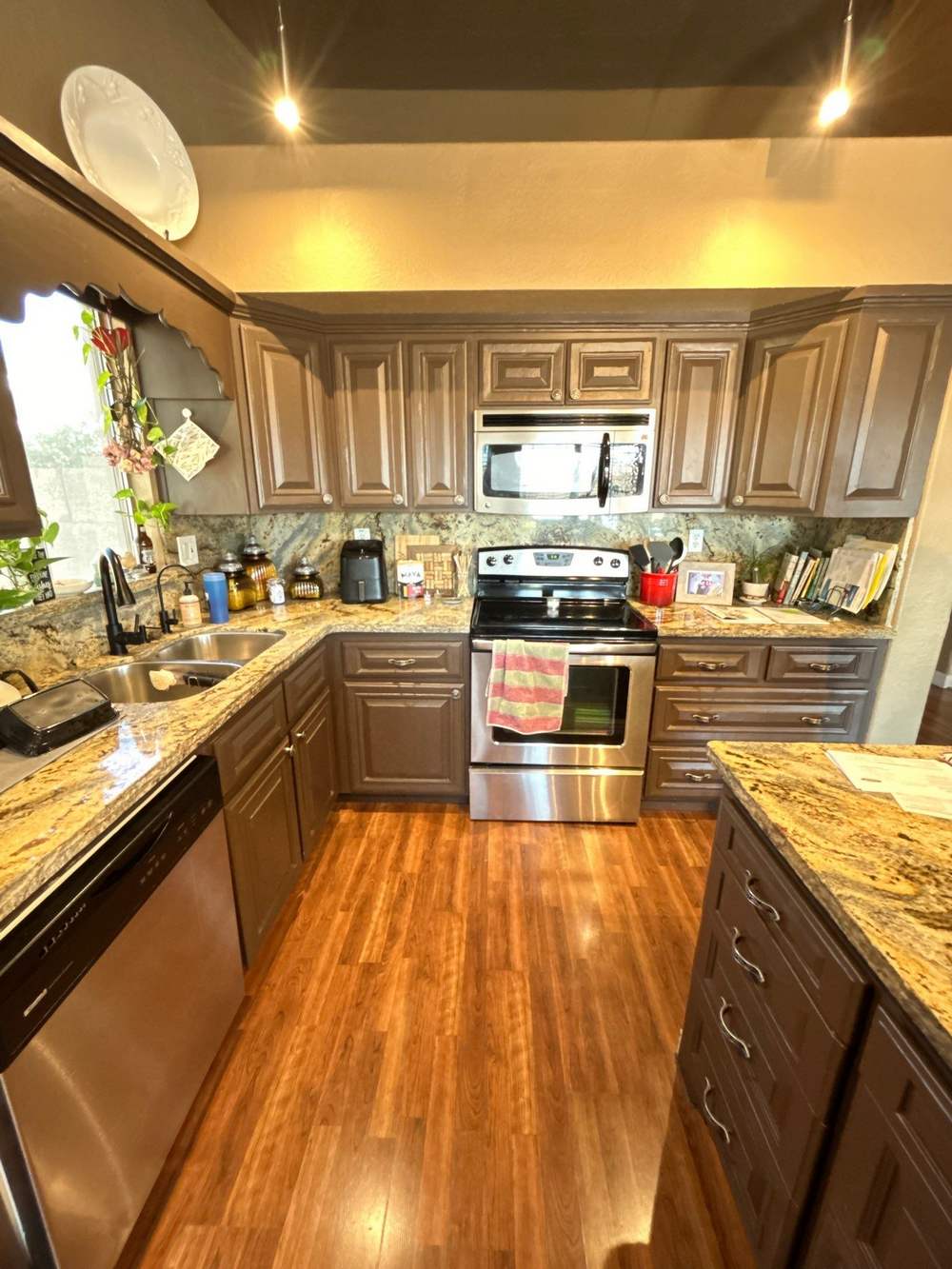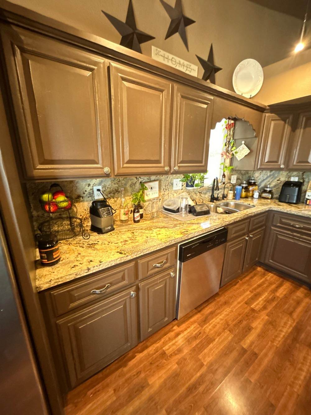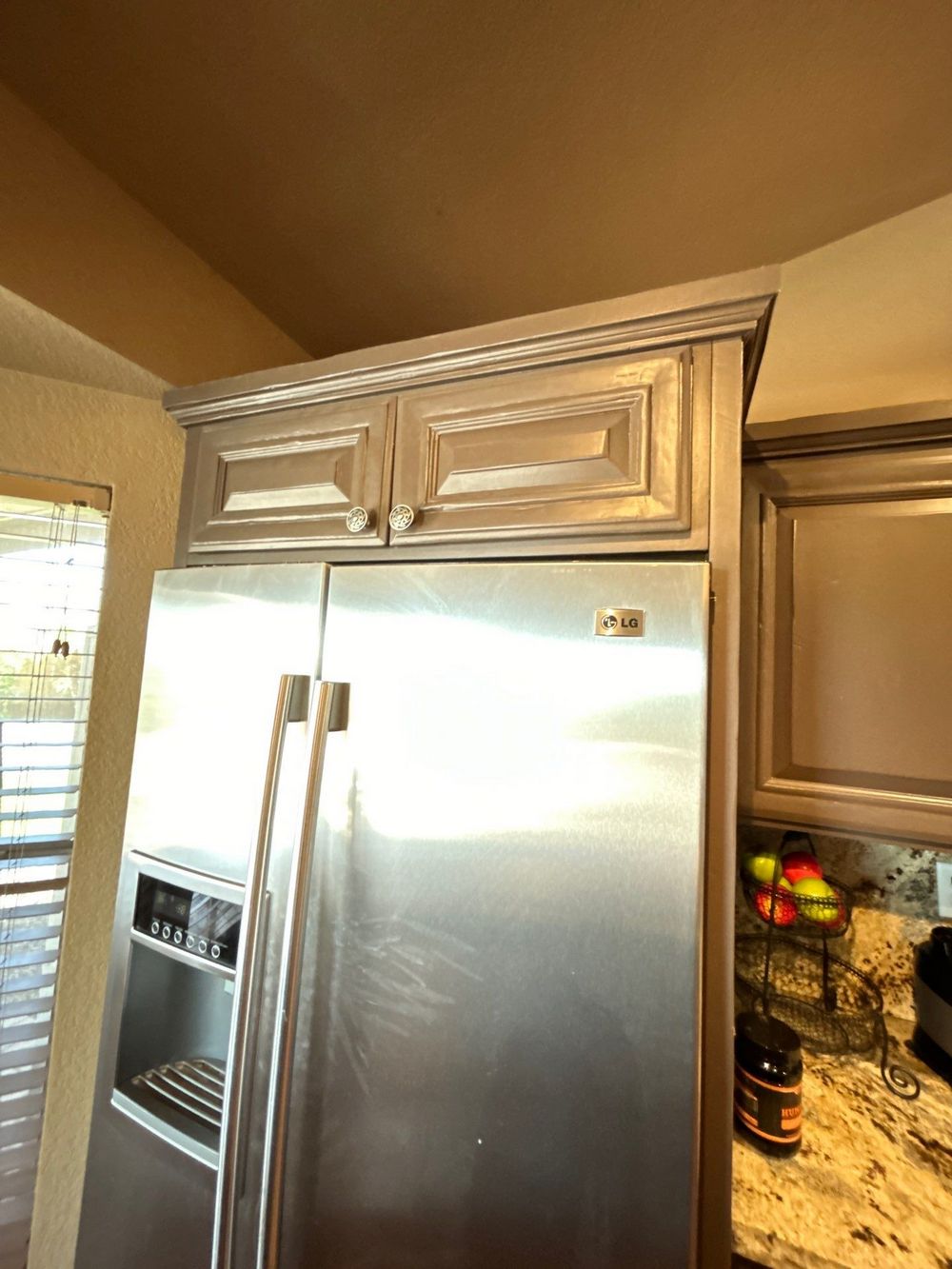 Take a look at this interior painting project our team recently completed that beautifully transformed this home in Mesa, Arizona. The focal point of this renovation was the kitchen, where the cabinets were refreshed with light brown paint. This color choice was expertly selected to complement the marbled countertops and silver appliances, breathing new life into the space and making the kitchen appear brand new. This revitalization enhances the kitchen’s visual appeal and provides a cost-effective alternative to a full cabinet replacement, extending the life of the existing cabinetry with a durable finish that withstands daily wear and tear.